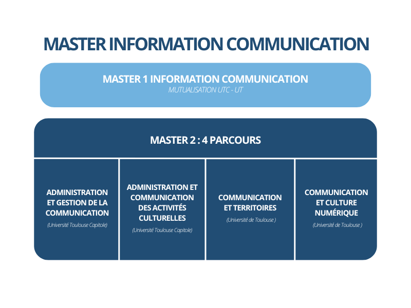 La mention infocom est portée par l’université Toulouse Capitole et l’Université de Toulouse. Elle offre au niveau master 4 parcours de formation et cette co-accréditation, sur ce périmètre spécifique du master a pour nom d’usage, l’Institut de la Communication de Toulouse.